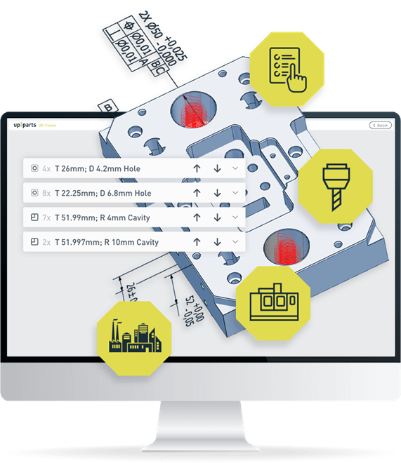 Design for manufacturability (DFM) analysis. Before work preparation even begins, up2parts flags potential production challenges—thin-walled elements, tight tolerances, features that could cause issues on the shop floor. Catching these early means fewer surprises later and more realistic estimates upfront.