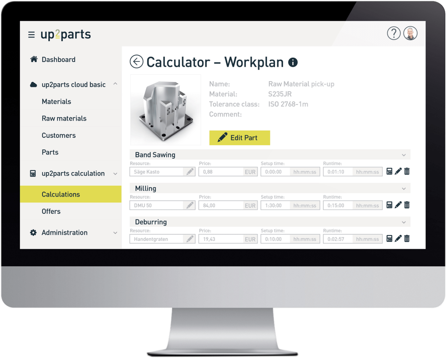 Work plans and cost estimation. Based on the geometry and your shop’s specific manufacturing knowledge, up2parts generates production work plans and automated cycle time estimates. These aren’t generic calculations—the system factors in your equipment, your processes, and your historical data. The result is more consistent, data-driven estimates that don’t depend on which programmer happens to be doing the quoting that day.