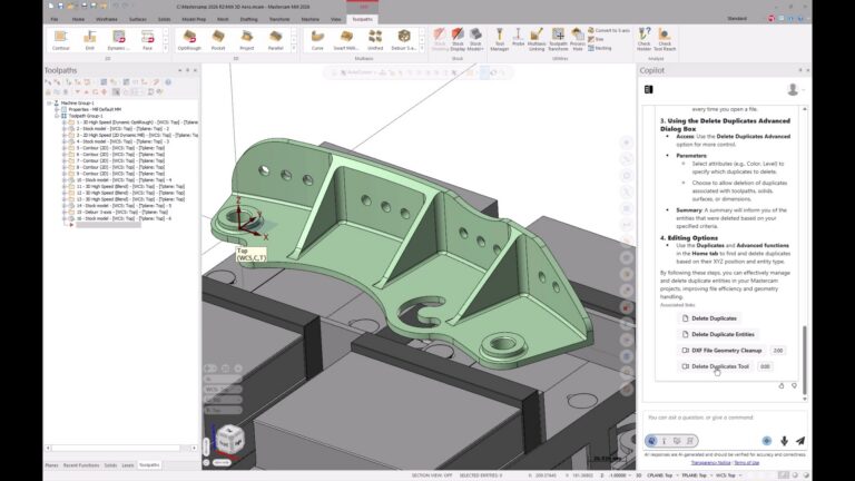 Mastercam Copilot is an AI-powered assistant built directly into the Mastercam CAM environment. Users can ask questions in plain language using voice or text and receive answers without leaving their workflow. Copilot can adjust feeds and speeds across operations or create machine groups based on simple instructions. By handling routine tasks, Mastercam Copilot allows programmers to focus on critical CNC programming decisions.